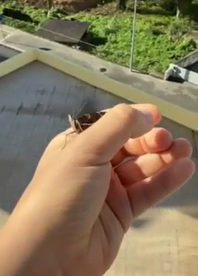 A hand is shown, holding a large butterfly on the thumb and index finger. The butterfly has brown and tan patterned wings and long antennae. The person is standing on a rooftop or balcony, with a cityscape and some greenery visible in the background. The hand moves slightly to show the butterfly from different angles. The sun is shining.