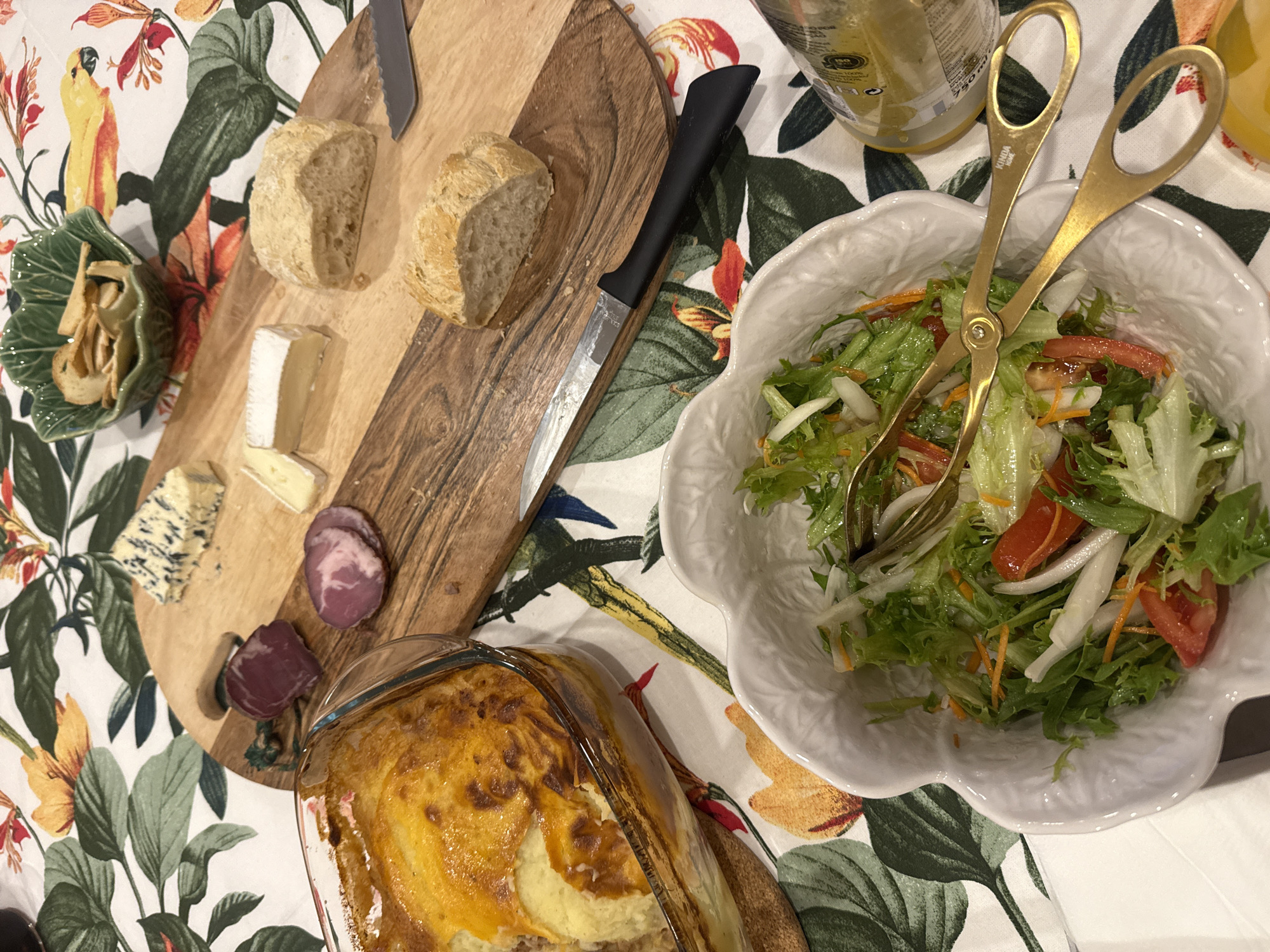 The image presents a table setting with a floral tablecloth, suggesting an indoor dining scene. In Vila Nova de Gaia, Portugal, based on the presence of Portuguese cuisine and cultural elements. A wooden serving board holds two halves of bread rolls, three types of cheese (including blue cheese and brie), and slices of cured meat. A knife rests on the board. To the left of the board is a small green dish filled with crisps. Next to the board is a glass baking dish containing a layered bake, appearing to be a shepherd's pie or similar dish. A white, ornate bowl filled with a green salad sits on the table with golden salad tongs placed inside. A bottle of liquid, possibly salad dressing or oil, is visible near the salad bowl. No people are visible in the frame. The setting is likely a home or restaurant meal preparation.