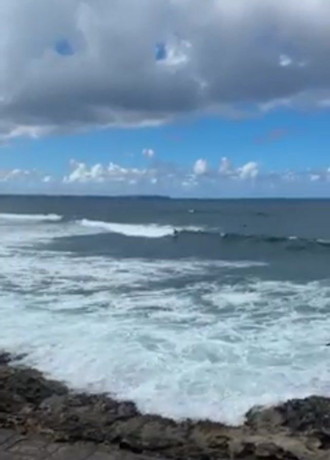 wide ocean view under a partially cloudy sky. The sea is dark blue, with waves breaking and creating white foam. At least one surfer is visible, riding a wave. The foreground consists of rocky terrain meeting a gray, paved area, suggesting a coastal path or walkway.