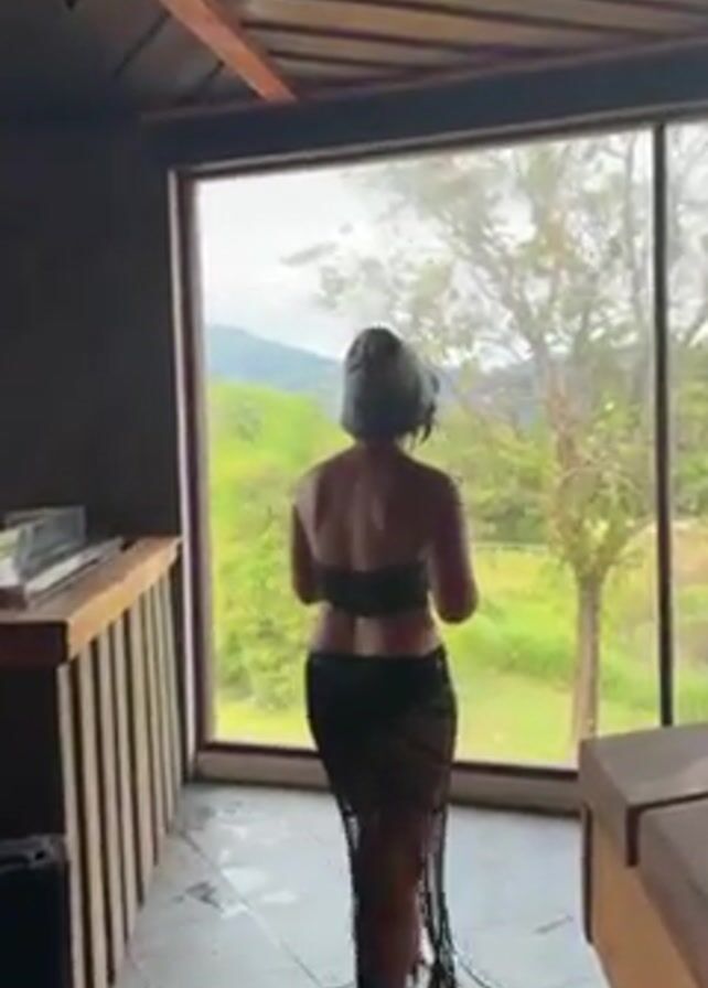 person standing in a room, facing a large window that overlooks a lush green landscape with mountains in the background. The person is wearing a black top, a black fringed skirt, and a hat or towel wrapped around their head. They hold a round, flat drum with a handle and appear to be preparing to play it. The room has a wooden ceiling and tiled floor. A wooden bar and other furniture are visible in the background.
