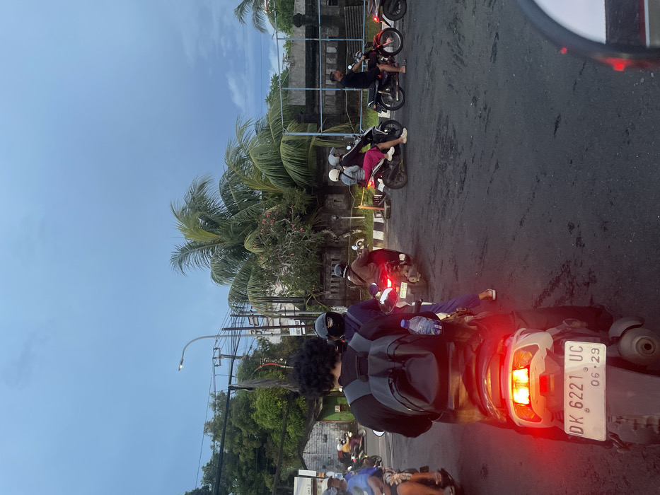 The scene depicts a street in Ungasan, Indonesia, under an overcast sky at dusk or dawn. Multiple individuals are stationary on motorbikes on a dark asphalt road. In the immediate foreground, facing away from the viewer, is a person with dark, curly hair, wearing a black long-sleeved shirt and a grey backpack. A plastic water bottle is secured to the side of the backpack. This person is seated on a white scooter with its red taillight illuminated. The scooter's license plate, "DK 6221 UC," is visible, along with the date "06-29." A partial view of a vehicle's side mirror is visible on the far right. Directly ahead of the foreground scooter, another person in a dark blue outfit and black helmet is seated on a scooter, with a passenger behind them. To their right, a person wearing a brown shirt and black helmet is on a red scooter, also displaying an illuminated red taillight. Further right, a black scooter carries two individuals, one wearing a white helmet and grey shirt, the other a grey helmet and pink skirt. Adjacent to them is a red scooter with a single male rider in a black shirt, who is not wearing a helmet. The right side of the road features a low concrete barrier painted with diagonal black and white stripes. Behind the barrier are green palm trees and other dense foliage. A concrete wall with a metal fence structure is partially visible through the trees. On the left side of the scene, a utility pole with numerous tangled wires stands prominently. A street lamp on a curved pole is illuminated. Behind the utility pole, a light-colored building with a faint "Cal 2" sign is visible. Another scooter with a rider is seen further down the road on the left. The overall lighting suggests ambient light mixed with artificial illumination.