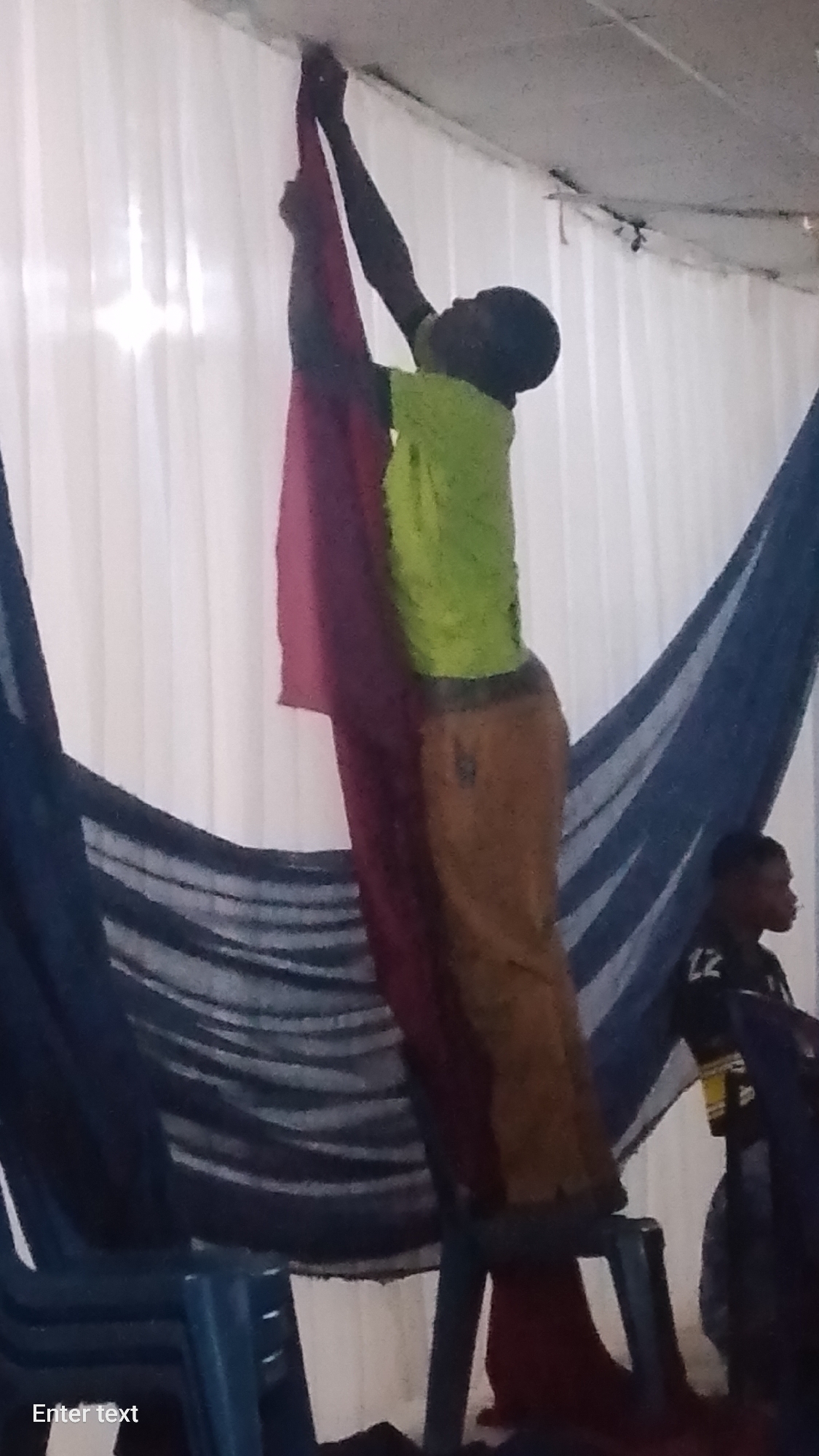 The image depicts an indoor scene in Gudi, Nigeria, where a young male is engaged in hanging or adjusting fabric decorations
