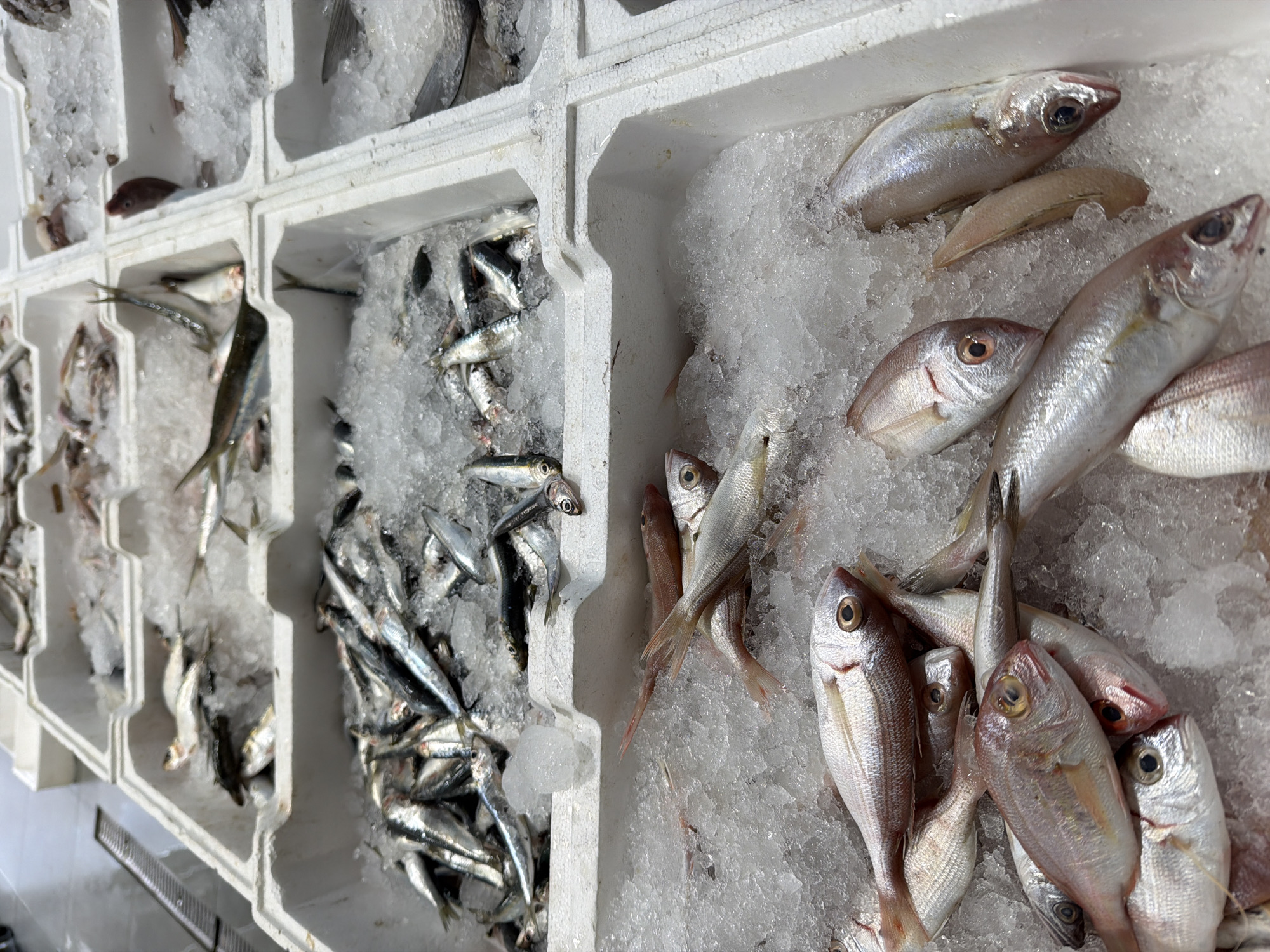 display of fresh fish in a retail setting. The fish are arranged on beds of crushed ice within a white, compartmentalized container. There are at least three distinct types of fish visible: small, silver fish, larger, silver fish with a pinkish hue, and what appears to be a fillet. The image was taken in Tirana, Albania.