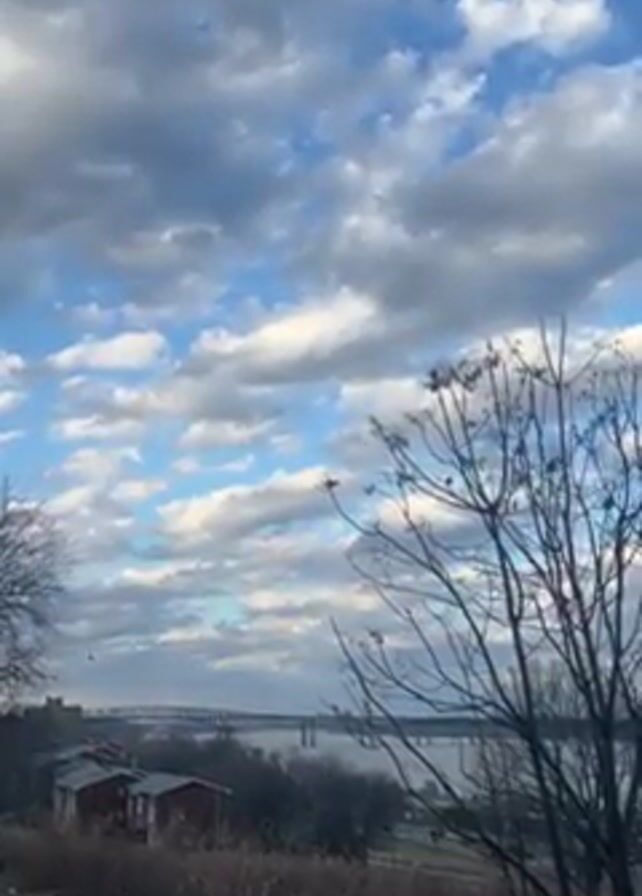 The video presents a daytime outdoor scene under a partly cloudy sky. The frame is dominated by the sky, which alternates between blue patches and white, puffy clouds. The lower part of the frame features a landscape with bare trees in the foreground, their branches reaching up against the sky. Behind the trees, there is a river or wide body of water, with a bridge spanning across it in the distance. Along the riverbank, there are small buildings, possibly houses or cabins, with red roofs. The ground in front of the buildings is covered with dry grass and vegetation. The video pans slightly to the right, showing more of the landscape and the water. The overall impression is a peaceful, scenic view.