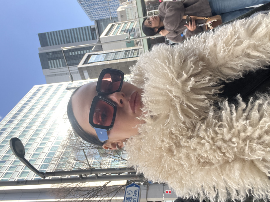 A woman wearing a fluffy white jacket and large square sunglasses is taking a selfie outdoors. High-rise buildings are visible in the background. To the left, there is a street light and a blue sign with Japanese characters. Another woman wearing a brown jacket and holding a phone is partially visible in the upper right corner. The image is slightly rotated.