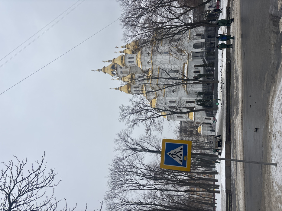 A wide, eye-level shot captures an urban winter scene under an overcast, light gray sky. In the immediate foreground, an asphalt road, partially wet and interspersed with small debris, runs horizontally. Its edges are lined with patches of dirty snow and slush. A blue square pedestrian crossing sign, bordered in yellow with a white pictogram, is mounted on a gray pole in the lower-left quadrant. Across the road, a line of bare deciduous trees with dark branches frames the scene. To the right of the frame, four individuals dressed in dark green work uniforms are standing on a snow-covered paved area. Two of these individuals hold long-handled tools, consistent with brooms or shovels. Near them, several dark birds are gathered on the snow. A dark metal fence separates this area from a large, ornate white building in the background. This prominent building features multiple levels and numerous golden onion-shaped domes and spires, indicating an Eastern Orthodox architectural style. One of the central, taller domes displays visible damage or weathering, revealing a darker material beneath the gold. To the left of the building, a light-colored utility truck is parked on a snow-covered section of ground adjacent to the trees. Faint outlines of other city buildings are visible beyond the trees. Thin, dark power lines stretch diagonally across the upper-right portion of the sky. The overall environment suggests an urban or semi-urban setting on a cold, winter day. The location is in the city of Unknown, Unknown.
