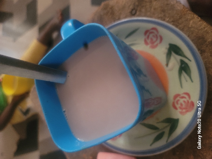 The scene depicts a light brown or pinkish beverage in a blue, square-shaped mug containing a silver-colored spoon. Small bubbles are present on the liquid's surface, and a dark speck rests near the mug's rim. The mug sits on a light green saucer adorned with a central orange circle and painted pink roses and green leaves. This assembly rests on a textured, brownish surface, possibly wood. In the blurry background, a person's limbs, potentially clad in yellow and green clothing, are partially visible, alongside a yellow bucket. The floor in the background features a black and white checkerboard tile pattern. A blurry light pink object is also partially visible on the left. The text "Galaxy Note20 Ultra 5G" is visible in the bottom left corner of the image. The location is Barakin Akawo, Nigeria.