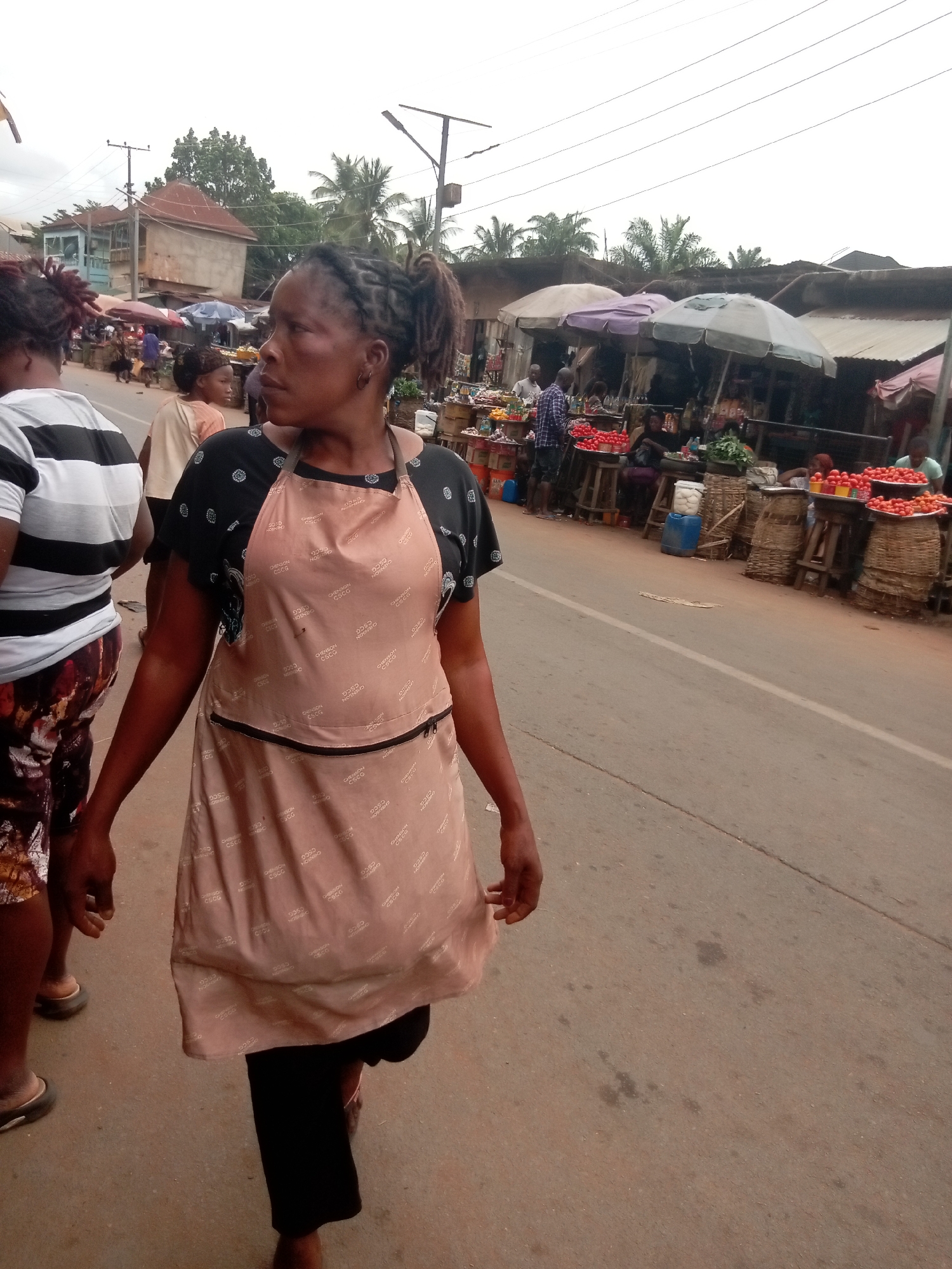 The photograph depicts a bustling marketplace located in Nkpor, Nigeria. An African woman in the foreground wears a pink apron with a black-trimmed pocket and the repeating brand name "CHENSON CSCG." She has braided hair pulled back in a partial ponytail and is dressed in black pants and a black and white shirt, walking to the right of the frame. To her left, partially obscured, are other people, one wearing a striped shirt and patterned bottoms. Behind the woman, the market scene unfolds along the street. Vendors are positioned under umbrellas and awnings, displaying various fruits, vegetables, and other goods in woven baskets and on tables. Buildings and utility poles line the backdrop of the street. The weather appears overcast.
