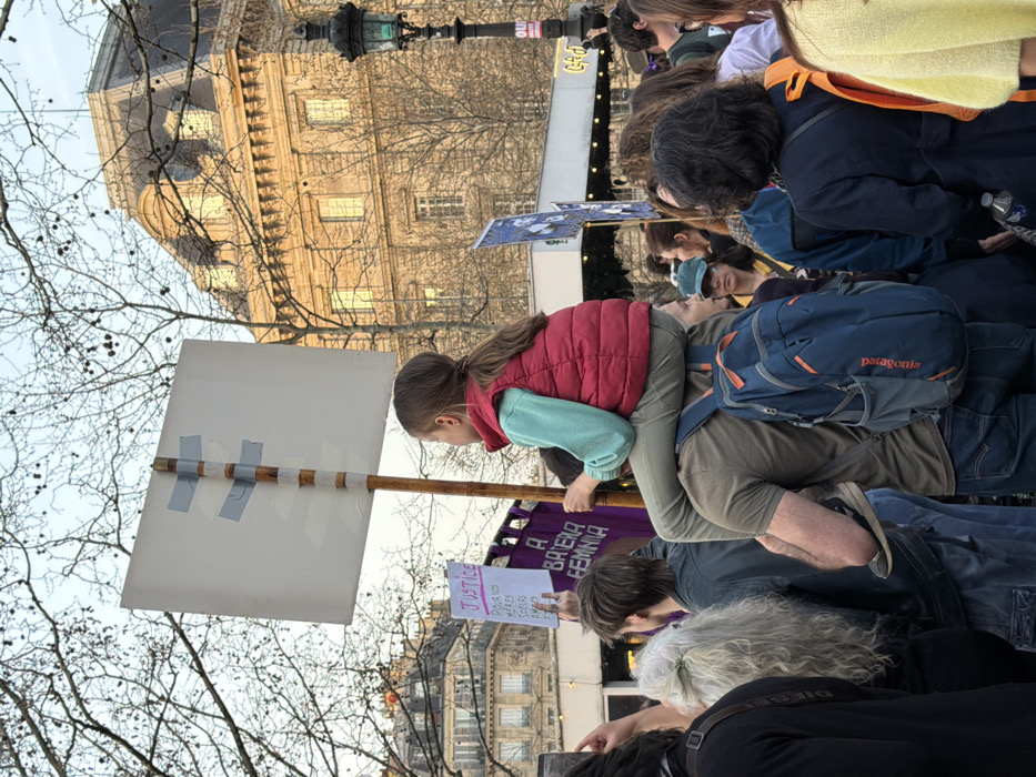 The image depicts a crowded outdoor public gathering or protest in central Paris, France, identifiable by prominent Haussmannian architecture, including a grand building with a mansard roof, and a classic Parisian street lamppost. Bare trees in the background suggest a cool season. In the immediate foreground, a young girl, wearing a red quilted vest over a light blue long-sleeved shirt and olive green pants, sits on the shoulders of an adult male. She holds a large, blank white sign constructed from two rectangular boards taped with grey duct tape to a wooden pole. The man supporting her wears a green t-shirt, blue jeans, and a blue Patagonia backpack. The surrounding area is densely populated with individuals, many holding signs. Directly behind the central figures, a person holds a sign with "JUSTICE" in pink letters, followed by "POUR NOS MÈRES SOEURS AMIES FILLES" and "A BATERIA FEMININA" on a purple banner. Other attendees carry various signs, and some are visible using mobile phones. The overall scene suggests a demonstration or march focused on women's rights.