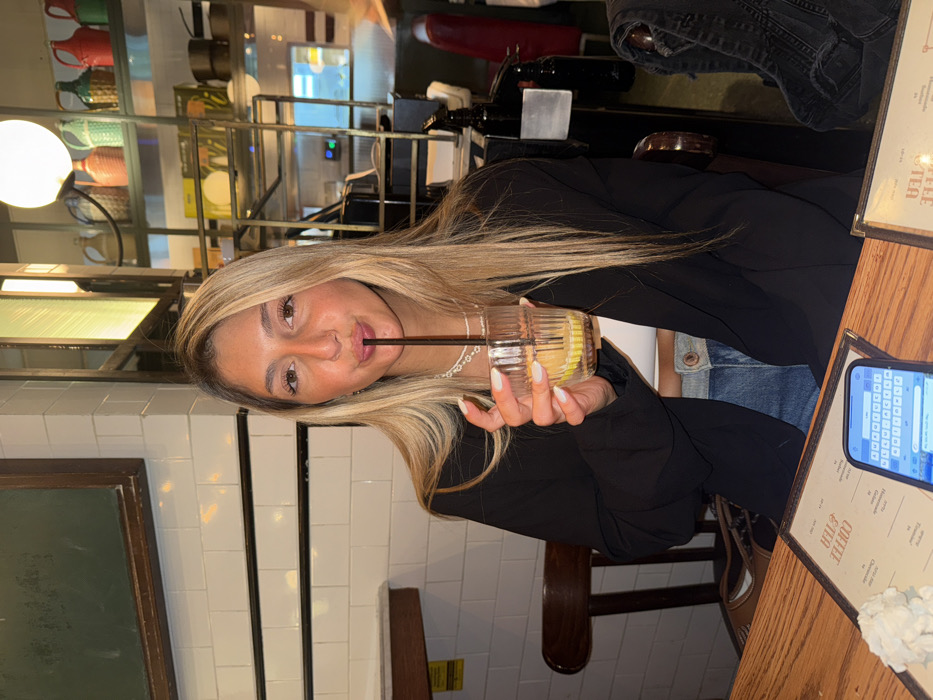 A young adult female is seated at a wooden table in an indoor restaurant or cafe, likely located in Tel Aviv, Israel, as indicated by visible Hebrew text and currency pricing on a menu. The subject has long, straight blonde hair, a tanned complexion, and a nose piercing. She is looking directly at the camera with her lips pursed around a black straw, actively drinking from a clear, ridged glass containing a beverage with lemon slices and ice. She is wearing a white crop top, blue denim jeans, a black open blazer, and a white beaded necklace. Her fingernails are painted white. On the wooden table in front of her are two menus in plastic sleeves, one open to a "Coffee & Tea" section with Hebrew text. A crumpled white napkin and a smartphone with an illuminated screen displaying a keyboard interface are also on the table. The background to the subject's left features a wall with white subway tiles and black horizontal trim, above which is a dark wooden framed object. A dark wooden chair is partially visible. The background to the subject's right reveals a more elaborate restaurant interior, including a display shelf with various colorful ceramic pitchers, a large spherical white pendant light, and industrial-style metal shelving. Hints of red booth seating and various bottles on a counter are also discernible.