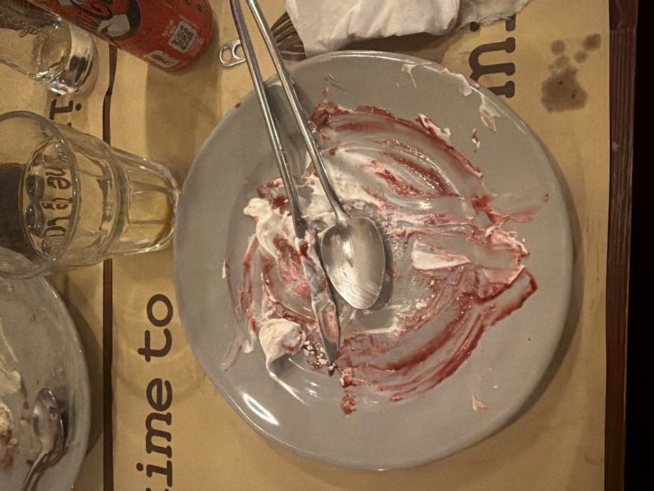 The image depicts an overhead view of a table at a café or restaurant, inferred to be Miminho in Braga, Portugal. This inference is based on the partial text "time to" and "mi" visible on the placemat, consistent with common branding and the explicit request for a Braga location. In the foreground, a round, light gray ceramic plate is covered with significant reddish-purple and white dessert remnants, indicative of a berry-based and cream dessert that has been consumed. Resting on this plate are a metal spoon and a metal fork, both stained with the dessert. To the right of this plate, a crumpled white paper napkin lies on the placemat. Above the foreground plate, a clear, textured glass tumbler contains a small quantity of amber liquid. A red 330ml Coca-Cola can, bearing Portuguese text and an open pull tab, is positioned to the right of the glass. Partially visible in the upper left quadrant is a second identical gray ceramic plate with minimal dessert residue and a single metal spoon. The table is covered by a light brown paper placemat featuring dark brown printed text, including the partial phrase "time to" in the upper left area and "mi" in the lower right. Several small, dark liquid spills are present on the placemat. The bottom edge of a dark wooden table surface is visible at the very base of the frame. No individuals are present. The scene indicates recent dining activity.