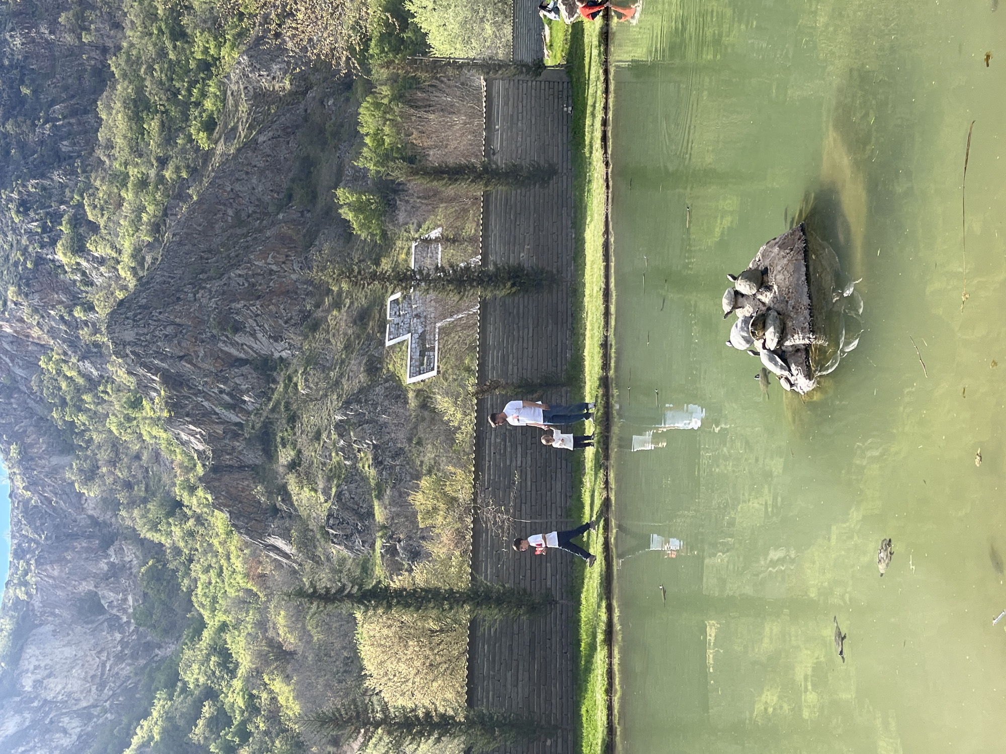 The image depicts a scene in General Todorov, Bulgaria, showcasing a serene pond populated by numerous turtles. The pond's water surface is murky, reflecting the surrounding elements. In the center, a rock formation emerges from the water, densely occupied by turtles basking in the sun. A group of people, including adults and a child, stand on the pond's edge, likely observing the turtles. A stone wall runs along the edge of the pond, separating it from the surrounding landscape. A lush, steep hillside with rocky outcrops and greenery dominates the background. The environment suggests a nature park or conservation area.