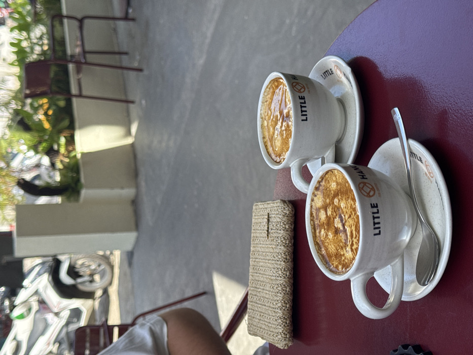 Two cups of coffee, each on its own saucer with a spoon, sit on a red table. The cups are white with the words "LITTLE HANOI" written on them. A beige, rectangular, woven item sits between the cups. In the background, there's a street scene with parked scooters and a chair near a white building. A person in a white shirt is seated at the table.
