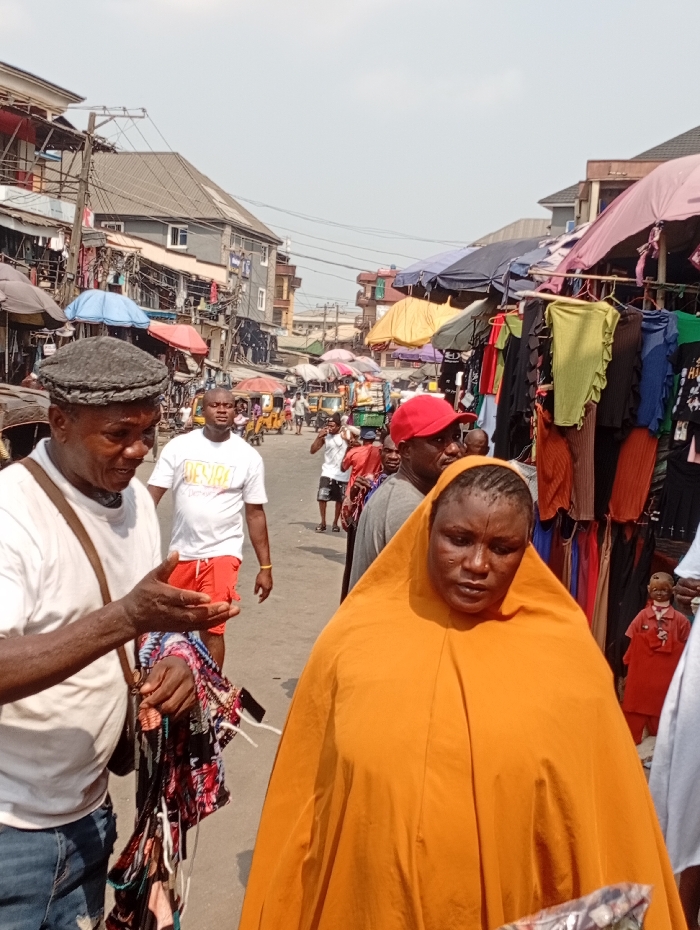 A woman in an orange hijab stands in a bustling outdoor market. An older man in a cap and white t-shirt holds up colorful fabrics, seemingly trying to sell them to her. Other people walk past in the background. Clothes hang from racks under various umbrellas and awnings. Buildings line the street, and the overall scene appears busy and vibrant.