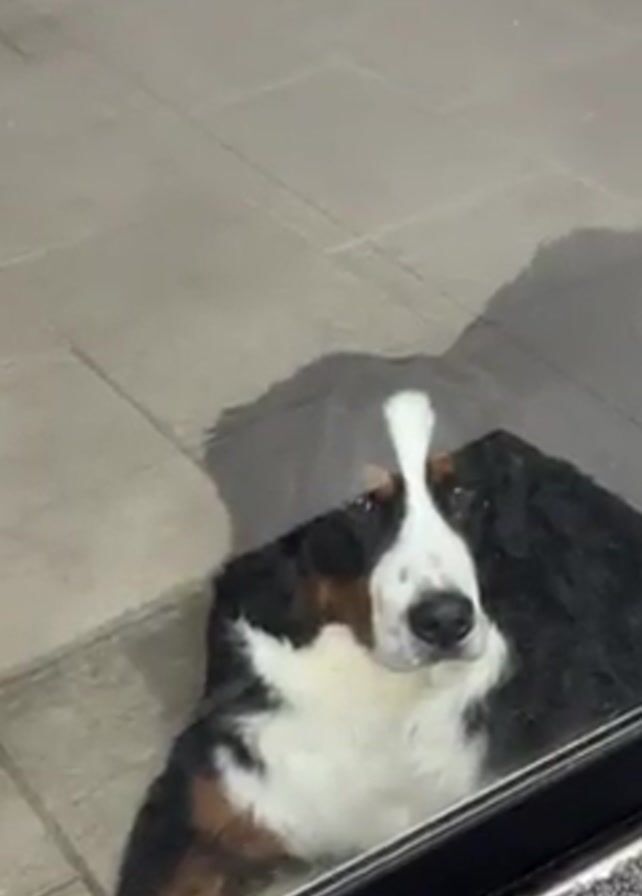 A black, white, and brown Bernese Mountain Dog lies on the floor, seen through a glass door
