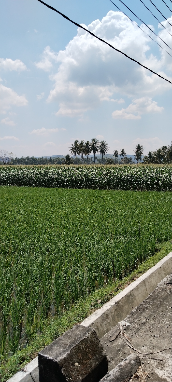 A vast expanse of verdant fields dominates the scene under a partly cloudy sky. The foreground features a lush rice paddy, its vibrant green stalks densely packed. Beyond this, a darker green field, possibly of corn, stretches to the horizon. A line of palm trees punctuates the distance, backed by low hills. Overhead, electrical lines cut across the sky. A concrete drain runs along the edge of the rice paddy, leading to a dark, weathered stone structure.