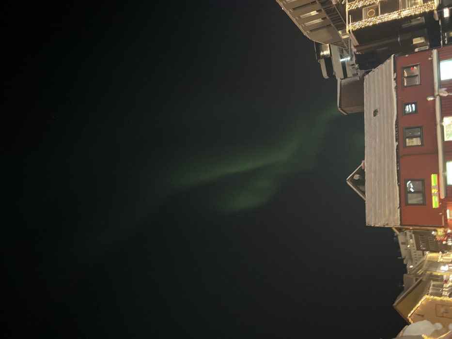 A nighttime shot reveals the aurora borealis illuminating the sky with a green glow. Traditional red buildings with lit windows are on the right, their roofs covered in snow. Street lights and decorative lights add brightness. The aurora extends across the sky to the left of the buildings.