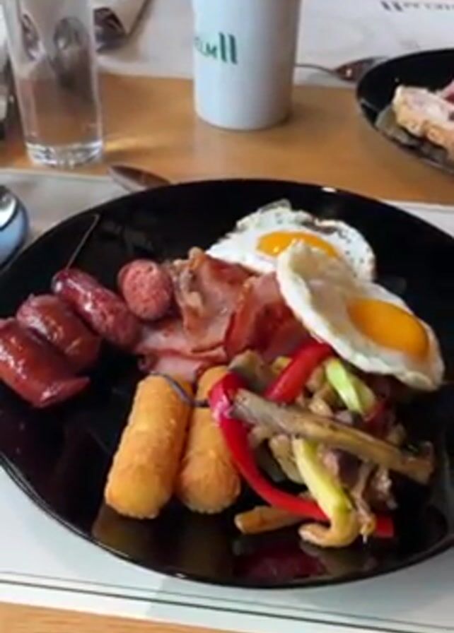 breakfast plate on a wooden table. The plate is black and has two fried eggs, bacon, sausages, potato croquettes, and sauteed vegetables on it. There is also a glass of water, a small plate, and a cup in the background. Someone’s hand can be seen briefly grabbing a napkin from the small plate. The environment appears to be a restaurant or hotel.