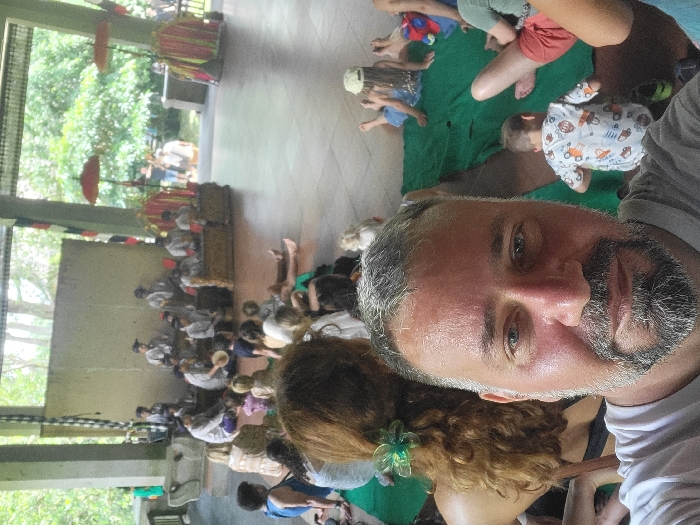 A man with graying hair and a trimmed beard takes a selfie. Behind him, a crowd of people is seated on the ground, facing a stage. On the stage are several musicians in matching gray outfits, playing traditional instruments. Red umbrellas decorate the stage area. Some people are seated on green fabric near the man, including small children. The setting appears to be an outdoor temple or cultural center.