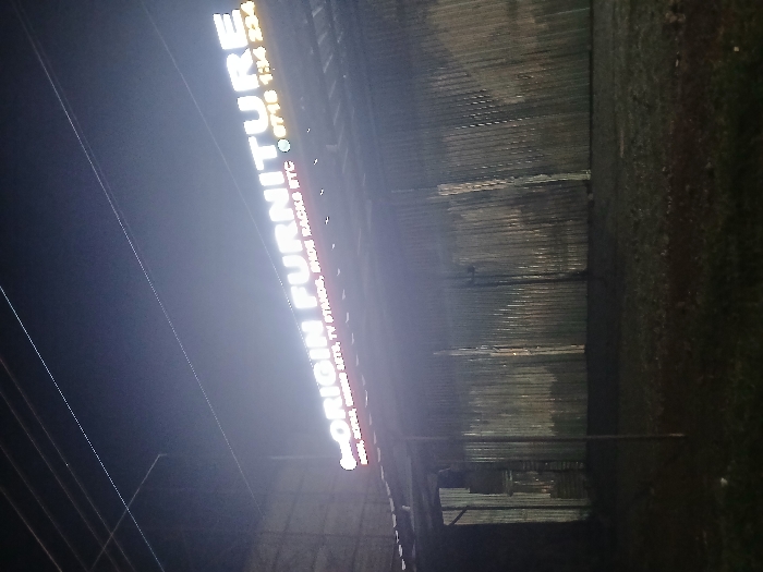 A nighttime shot features "Origin Furniture" in bright, illuminated block letters atop a building. The sign advertises sofas, beds, TV stands, shoe racks, etc., and includes a phone number, 0716 134 234. The building has a corrugated metal exterior and appears to be under a roof or covered structure. Electrical wires are visible in the dark sky to the left of the sign. The image is somewhat blurry, likely due to the low-light conditions.