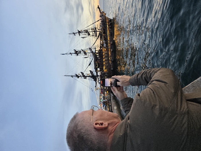 The image displays a twilight scene along the waterfront of Thessaloniki Municipal Unit, Greece. In the foreground, a male individual is positioned with his back partially to the viewer, facing a large ship. He has short, light gray hair and wears eyeglasses with thin frames and a dark olive-green jacket. The man is actively holding a black smartphone horizontally with both hands, capturing a photograph of the vessel. The smartphone screen displays a smaller rendition of the same scene. The primary subject is a multi-masted sailing ship, resembling a historic tall ship or pirate vessel, floating on dark, rippled water (Thermaic Gulf). The ship is extensively illuminated with numerous yellow and white string lights draped across its three masts, rigging, and deck levels. The sky transitions from a light blue at the top to a pale orange/pink hue near the horizon on the right, indicative of dusk. A concrete edge, likely part of a promenade or pier, runs across the lower foreground.