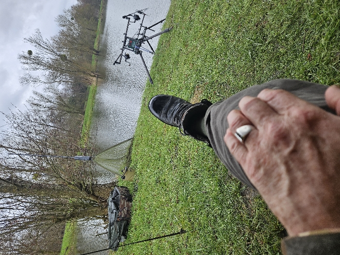 The image depicts an outdoor fishing scene on an overcast day in the city of Gavisse, France. In the foreground, the extended leg and right hand of an individual are visible. The hand, exhibiting visible veins and freckles, wears a silver-colored signet ring on the ring finger and rests on the thigh of dark-colored trousers. A dark boot is visible further up the leg. The individual is positioned on a green, grassy bank beside a body of water. To the left, a green camouflage fishing bag and a D-shaped green fishing net stand near the base of a bare-branched tree. A single fishing rod with a rod rest is partially visible on the far left. To the right, at the water's edge, a black rod pod supports at least two fishing rods, each equipped with electronic bite alarms. The water surface is calm, reflecting the muted light. The opposite bank is lined with multiple deciduous trees, mostly bare of leaves, some clearly showing clusters of mistletoe. The sky overhead is uniformly grey and cloudy.