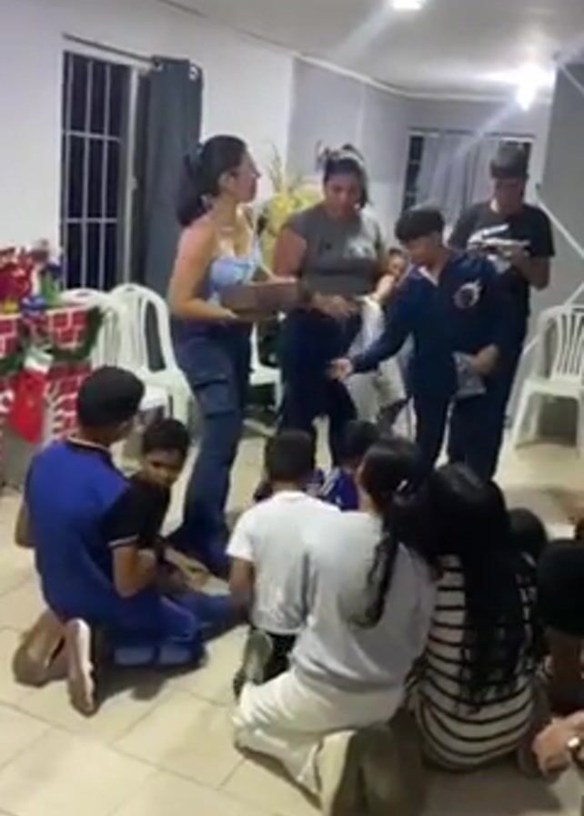 A group of people, including adults and children, are gathered indoors, sitting and kneeling on the floor in a circle. Several adults stand around the circle, distributing gifts. One adult female, wearing jeans and a light blue top, stands at the edge of the circle. Another adult female stands behind her, holding a bag of gifts. A young boy stands on the right side of the frame, looking at a gift in his hand. There are also adults and kids watching from the side. The room is lit with white lighting, and a Christmas stocking and other decorations can be seen in the background. The floor is covered with light beige tiles.