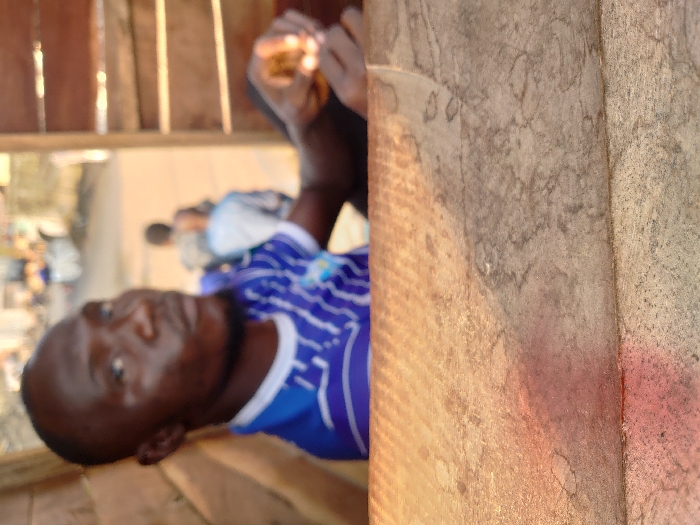 An upward-tilted portrait captures a dark-skinned man with short hair and a white and blue striped shirt. The man gazes directly at the viewer. In the background, indistinct figures and wooden structures create a blurred scene. To the right, a textured, light-colored wall features subtle gray patterns and a faint pinkish hue near the bottom. The overall composition suggests an informal or candid snapshot.