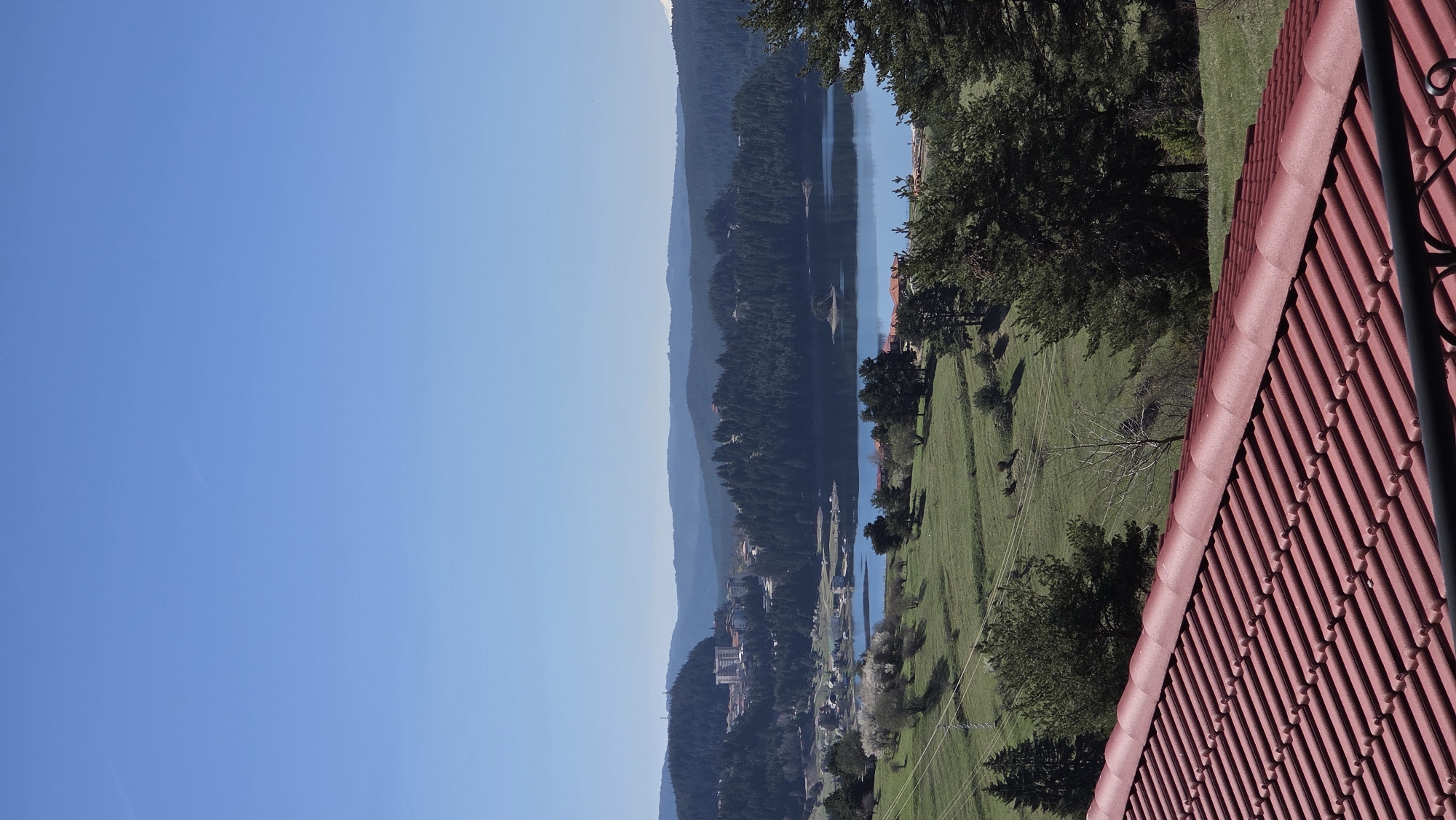 A landscape view from an elevated position, possibly a balcony or rooftop, showing a broad panorama