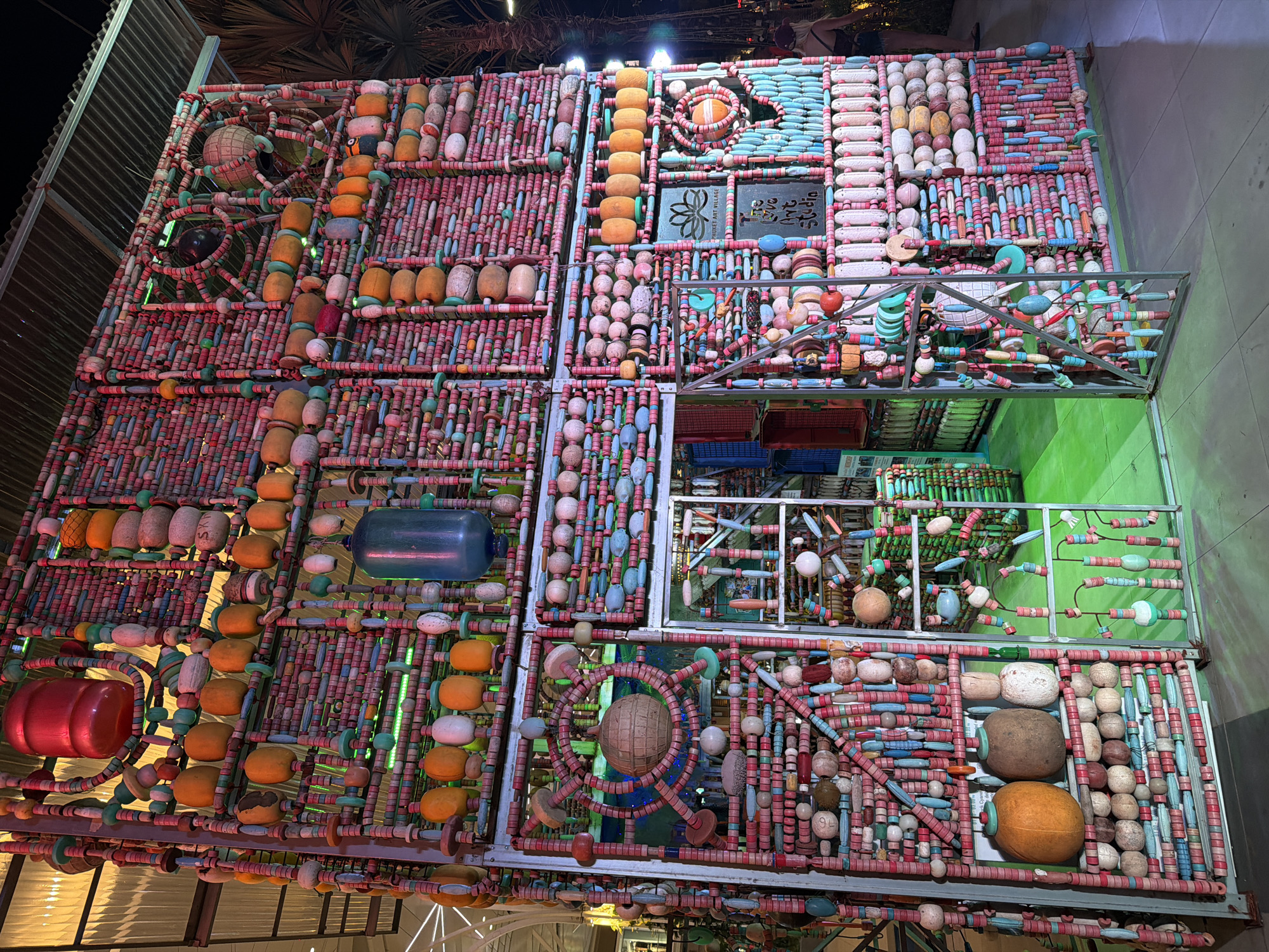 This image depicts a large, intricately decorated art installation serving as a building facade, prominently located at the Phuket Art Village, which houses The Love Art Studio in Patong, Phuket, Thailand. The primary subject is a multi-sectioned structure, approximately two stories high, constructed from a metal framework densely covered with thousands of repurposed objects. These objects include cylindrical beads or small floats, primarily in shades of red, pink, light blue, and teal, arranged both horizontally and vertically to form a textured, mosaic-like surface. Interspersed among these are larger, rounded buoys or floats in colors such as orange, white, and mottled grey, often arranged in rows or clusters. Notable larger objects include a red cylindrical container at the top left, a blue cylindrical container near the middle right, and several spherical objects resembling fishing net floats. The structure features an open central doorway and another open doorway to its immediate left. Both entryways are also adorned with the same decorative elements and reveal an interior illuminated with a vivid green light. Above the right doorway section, a black sign with a white lotus symbol reads "Phuket Art Village," and below it, another black sign states "The Love Art Studio." The scene is captured at night. The installation is brightly lit, with internal green lighting emanating from the doorways creating a strong contrast with the exterior. The ground in front consists of light-colored paving tiles. To the right, tall palm trees are visible, illuminated by bright background lights. A corrugated metal roof is partially visible at the top. A person is partially visible on the far right, standing with their back to the camera, wearing a light-colored top.