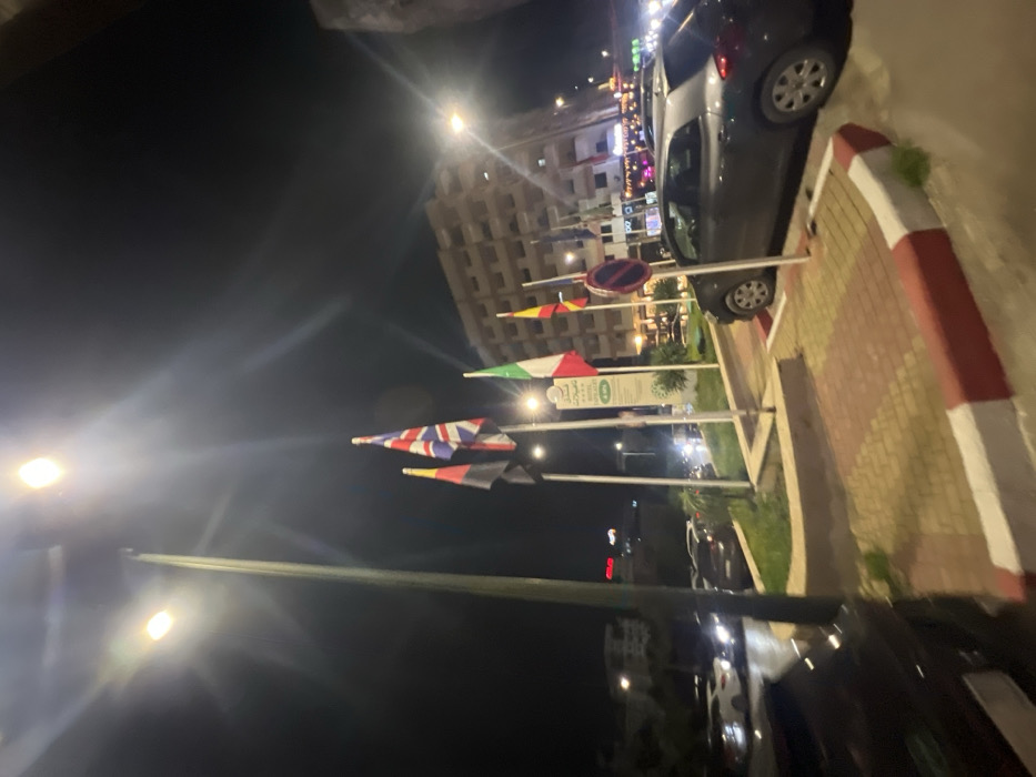 Nighttime street scene with a row of flags representing different countries, including the United Kingdom, Belgium, Italy, and Germany