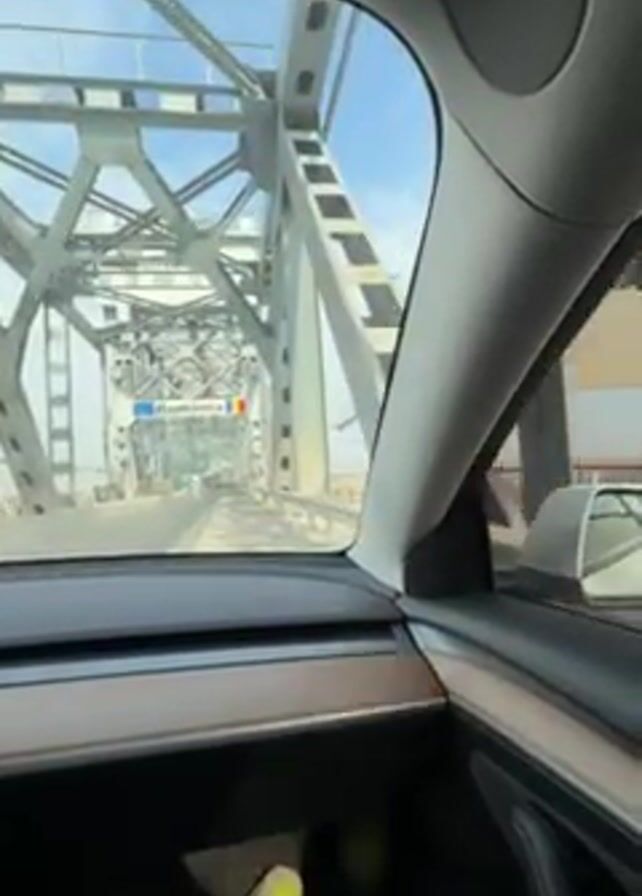 A vehicle drives over a large steel bridge. The driver is wearing sneakers. The bridge is the Giurgeni-Vadu Oii Bridge over the Danube River, connecting Romania and Bulgaria. The view from inside the car shows the bridge's steel structure, the road ahead, and the river on either side. A sign indicating "Romania" can be seen at the end of the bridge. The sky is light blue and hazy.