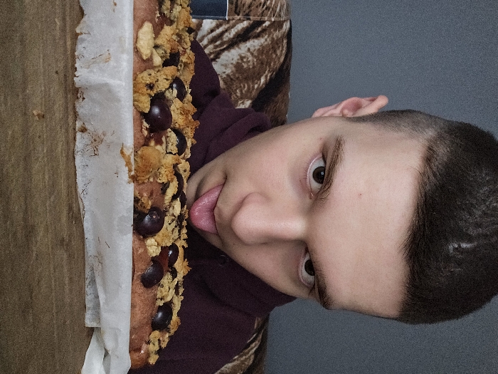 A young individual, appearing male, is depicted in a front-facing, eye-level shot indoors in German, Bulgaria. The subject has short, dark hair, brown eyes, and is wearing a dark maroon hoodie. Their tongue is extended downwards, centered in the lower part of their face. Directly in front of the subject, filling the lower third of the frame, is an elongated baked item. This item is light brown, covered with streusel-like crumbles, and topped with approximately a dozen dark, round fruits, consistent with plums or dark cherries. The baked item rests on a sheet of white parchment paper, which is placed on a wooden surface exhibiting distinct grain. The background consists of a plain, dark gray wall, with a section of brown and black patterned fabric visible behind the subject's left shoulder.