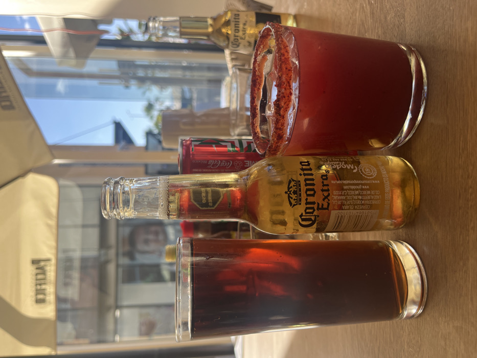 The image displays a close-up, eye-level perspective of three beverages positioned on a light-colored wooden table, suggesting a setting within an establishment in Santiago de Querétaro, Mexico. From left to right, the items are: a tall, clear glass filled approximately three-quarters with a dark brown, carbonated liquid; a 210 ml glass bottle of Coronita Extra beer, partially consumed, with its label clearly visible; and a short, wide clear glass containing a deep red liquid, likely a michelada, distinguished by a prominent red spice coating (chili powder or similar) on its rim and visible ice cubes. A red Coca-Cola can is partially visible behind the Coronita Extra bottle, and another Coronita Extra bottle is visible, out of focus, further to the right in the background. The background features large glass panels reflecting a bright blue sky, distant building structures, and a large, light-colored outdoor umbrella with reversed text, possibly "PACIFICO." A blurry reflection of a human face is also discernible in the upper left portion of the background reflections. The scene is brightly lit by natural daylight. No individuals are directly visible, nor are any specific actions or interactions depicted beyond the static arrangement of drinks.