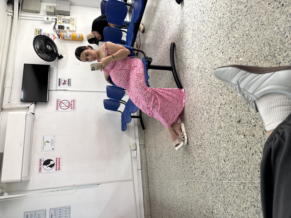 The image depicts a public waiting area within Perimetro Urbano Pereira, Colombia, characterized by white walls and a light-colored terrazzo floor with dark speckles. In the mid-ground, a visibly pregnant female subject is seated on a blue plastic waiting chair with a black metal frame. She wears a pink, off-the-shoulder maxi dress with a floral pattern and white slide sandals. Her dark hair is pulled back, and she is holding a light-colored smartphone, seemingly taking a selfie or viewing content, with a slight pout on her face. To her right and slightly behind her, a male subject is partially visible, also seated on a similar blue chair. He wears a dark t-shirt and a light-colored baseball cap reversed, looking downward. In the foreground, the legs and feet of a person wearing dark pants, white socks, and light grey Adidas Samba-style athletic shoes are visible, positioned as if taking the photograph. The white walls display multiple signs in Spanish: "POR FAVOR GUARDAR SILENCIO" (Please Keep Silence), a green sign with "Respire con tranquilidad" (Breathe with tranquility), "PROHIBIDO USAR EL CELULAR" (Prohibited to Use Cell Phone), and "PROHIBIDO CONSUMIR ALIMENTOS" (Prohibited to Consume Food). A wall-mounted white air conditioning unit is positioned high on the left, with a black flat-screen television and a black oscillating fan mounted further right. Below these, a red fire extinguisher and a "PELIGRO RIESGO ELÉCTRICO" (Danger Electrical Risk) sign are present. White electrical outlets are visible near the floor. The setting suggests a clinic or public service waiting room.