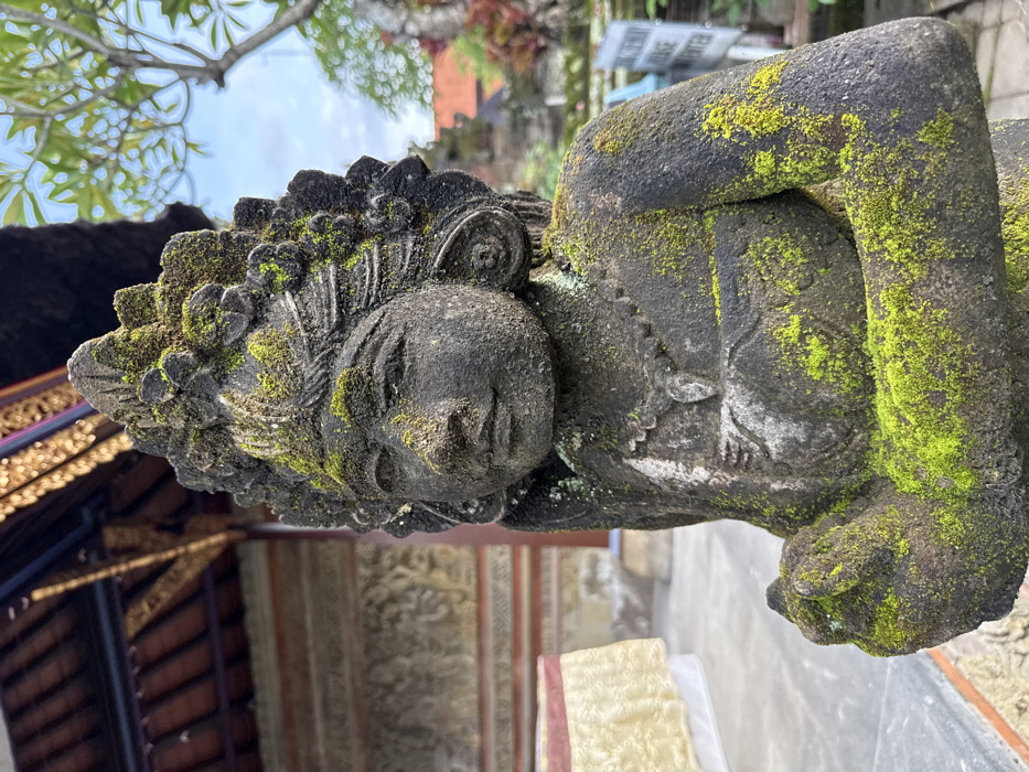The image presents a weathered dark grey stone statue, likely depicting a female figure, standing outdoors in Batuan, Indonesia