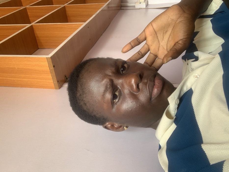 The image presents a close-up, indoor portrait of a dark-skinned individual with short, dark hair, looking directly at the camera. The subject wears a polo shirt featuring horizontal stripes of dark blue and off-white/cream. A small, gold-colored stud earring is visible in the subject's right earlobe. The individual's brow is furrowed, and lips are slightly pursed, indicating an expression of skepticism or contemplation. The left hand is partially raised, with fingers slightly splayed, resting against the left side of the subject's face. The background consists of a plain, light-colored wall to the left and a light-toned wooden shelving unit with multiple square compartments occupying the upper right quadrant of the frame. The shelving unit exhibits visible fasteners on its underside. The specific location within Zaki Biam, Nigeria, cannot be determined from the visual information provided.