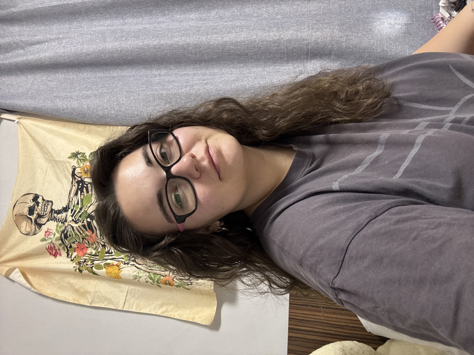 A female individual, appearing to be a young adult, is depicted from the chest up, positioned slightly off-center to the right of the frame, in what is identified as a location within the city of Zlatitsa, Bulgaria. She has dark, wavy hair extending past her shoulders and wears black-framed glasses with subtle pink accents on the temples. Her attire consists of a loose-fitting, dark grey t-shirt featuring a faint light grey graphic design on the front. Small hoop earrings are visible in her left ear. She maintains direct eye contact with the camera, exhibiting a neutral facial expression. The background consists of several elements: A light-colored wall is visible on the left side of the frame. Attached to this wall is a rectangular fabric tapestry, which illustrates a skeletal figure adorned with a variety of colorful flowers and foliage on a light, parchment-like background. Below and to the left of the individual's shoulder, a section of wall with vertical brown wood paneling is present. A light-colored, possibly plush, object is partially visible in the lower-left corner, adjacent to the wood paneling. To the right of the individual, a drawn grey fabric curtain with visible vertical folds covers a portion of the background. The scene is illuminated by ambient light.