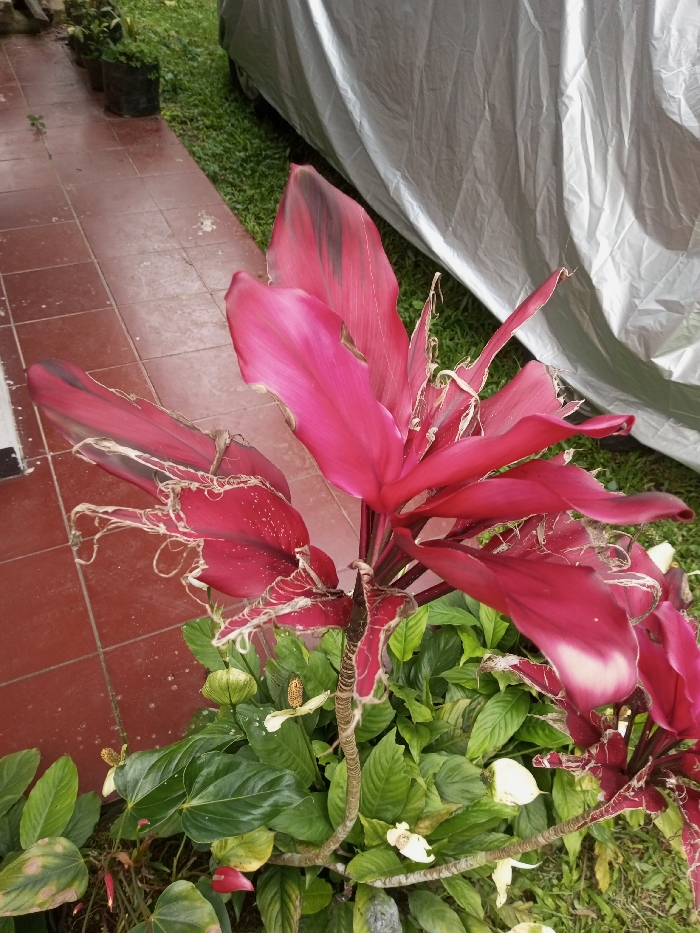 The scene is an outdoor setting in Naya andura, India. The foreground and midground are dominated by a plant featuring large, deep magenta-red leaves. Multiple leaves display significant fraying and tears along their edges, with white fibrous material emanating from these damaged sections. Beneath this plant are smaller green-leafed plants, among which are several white flowers with prominent spadices and one discernible green, textured seed pod. The ground consists of terracotta-colored square tiles on the left and green grass on the right. In the upper right background, a large, crinkled silver tarp covers an unseen object, likely a vehicle. In the distant left, small black plant pots containing green foliage are visible on the tiled surface.