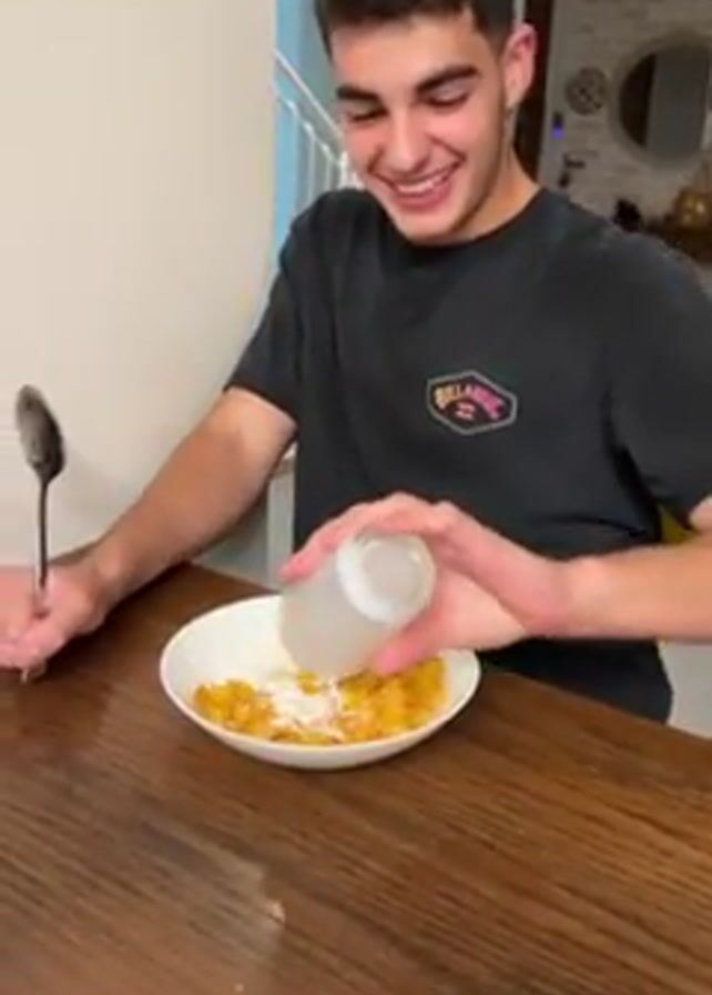 A young man is seated at a wooden table, pouring milk into a bowl of cereal. He is wearing a black t-shirt with a yellow and orange graphic that reads "Billabong". He is holding a spoon in his left hand and a small glass bottle of milk in his right. He looks at the camera and laughs as he pours the milk. The table is light brown wood. There is a white wall behind him, and in the background, a partial view of a staircase and decorative mirror can be seen.