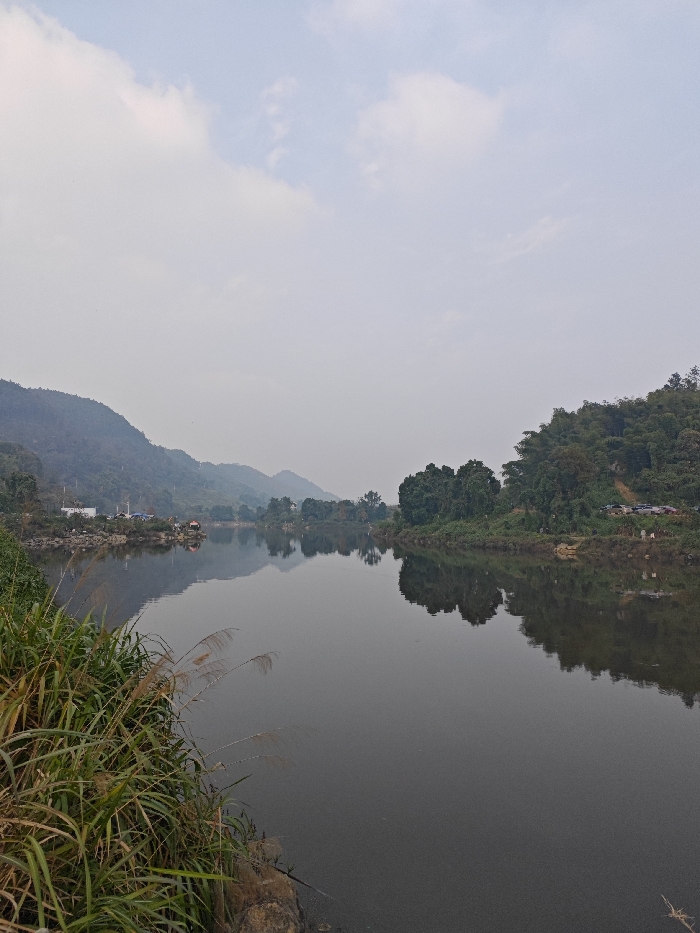 A serene lake reflects an overcast sky and tree-covered hills. Lush green grasses and reeds line the left bank, contrasting with the dark water. The reflections of the trees and hills are clearly visible on the lake's surface. A small cluster of buildings is nestled among the trees in the distance, adding a touch of civilization to the otherwise natural landscape. The overall scene evokes a sense of peace and tranquility.