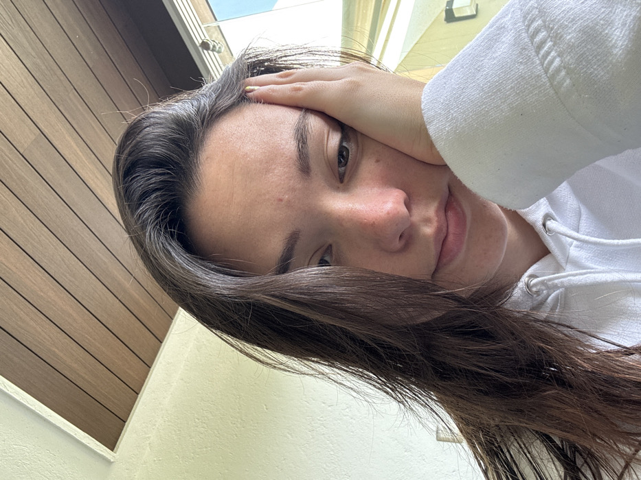 A selfie captured from below showcases a young woman with light skin, brown hair, and brown eyes. Her hand rests on her forehead, partially obscuring her face. She wears a white hooded sweatshirt. The background consists of a light beige wall, dark brown wood paneling, and a glimpse of sky through a window. The image is brightly lit, giving it a warm and inviting tone.
