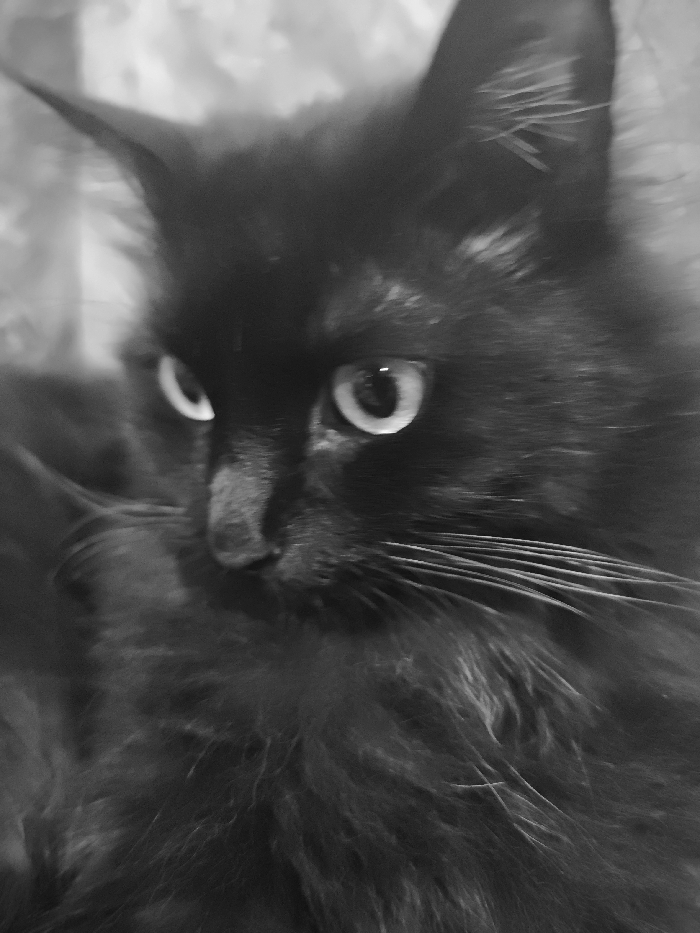 - "A monochrome, close-up portrait features a fluffy black cat" by FM-P9SdV2, licensed under CC BY 4.0