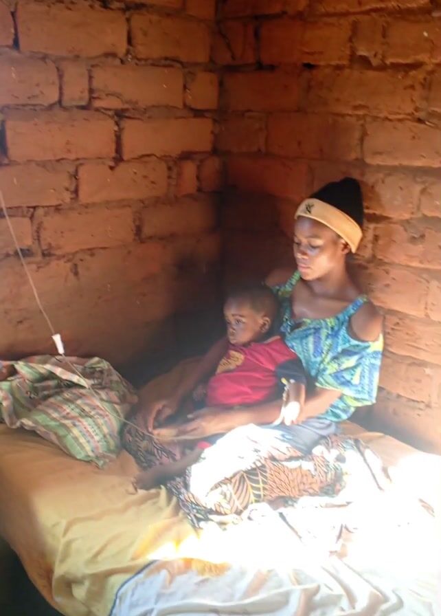 A woman in a blue and green patterned top and a black beanie with a yellow brim sits on a bed in a room with brick walls. She is holding a young child wearing a red shirt in her lap. An IV drip is hanging near the bed. A patterned bag sits on the bed next to her. The room is dimly lit, but sunlight is streaming in. Both the woman and child are looking towards the right side of the frame.