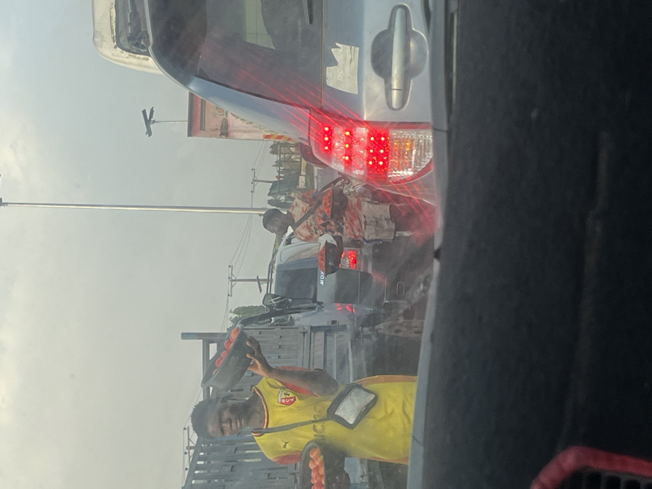 A street vendor in a yellow jersey carries a tray of tomatoes through traffic. He is next to a man in an orange shirt who appears to be another vendor. They stand near the back of a truck. Red brake lights glow from the car in front, partially obscured. A tall metal pole with a bird-like figure on top stands in the background under a hazy sky.