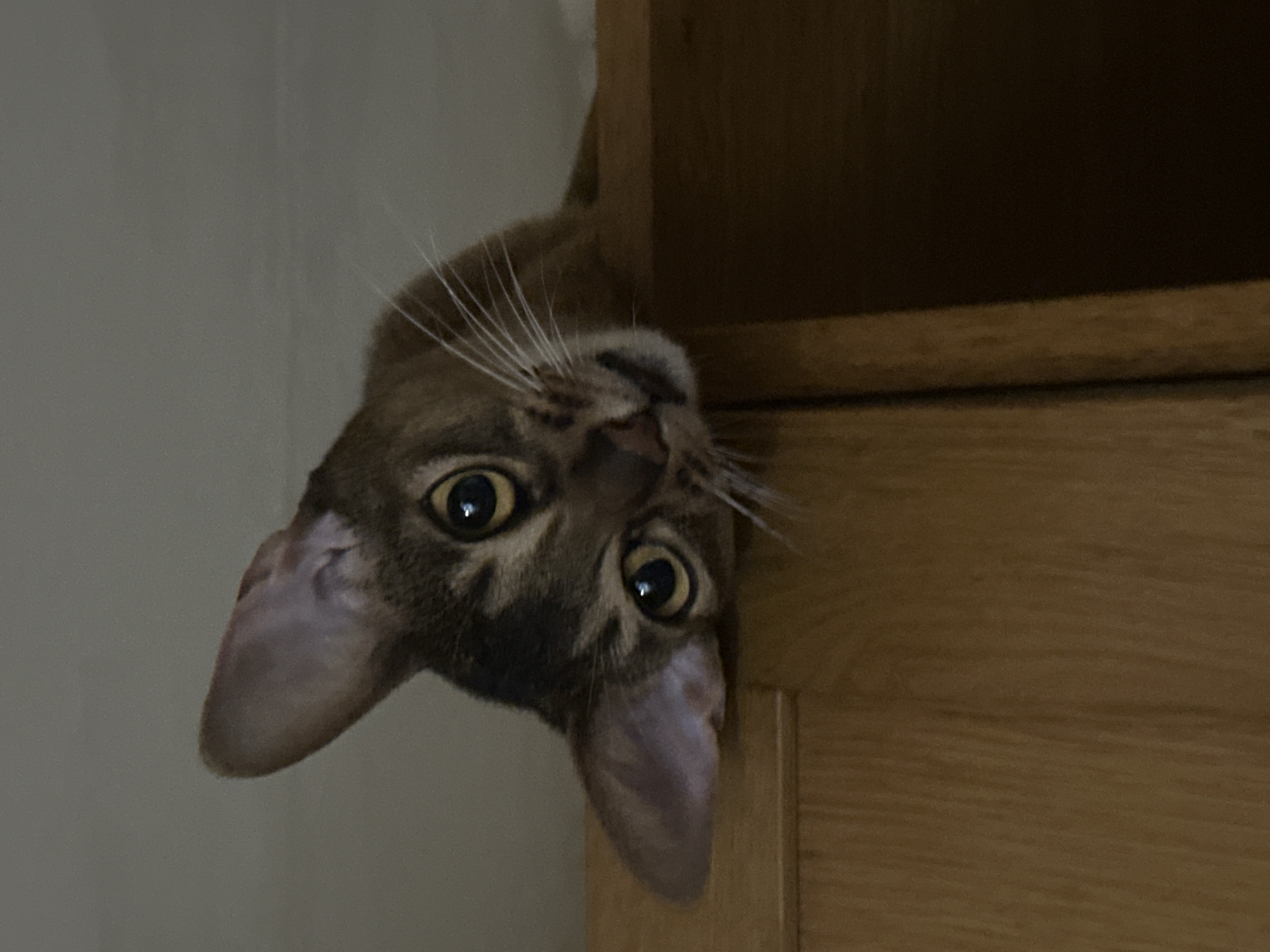 A short-haired domestic cat with ticked brown and golden fur, prominent ears, and large, round amber-yellow eyes is depicted. The cat's head is tilted to its left, and it is positioned peering over the top edge of a piece of light-brown wooden furniture, possibly a cabinet or wardrobe, which exhibits visible wood grain. Its white whiskers are clearly visible against its muzzle. The background above the cat is a light, neutral-colored wall or ceiling, while the area to the cat's lower right is dark, suggesting an interior shadow or unlit space. The scene is illuminated by ambient light, reflecting in the cat's pupils. The specific location within Moscow, Russia, cannot be determined from the visual information provided.