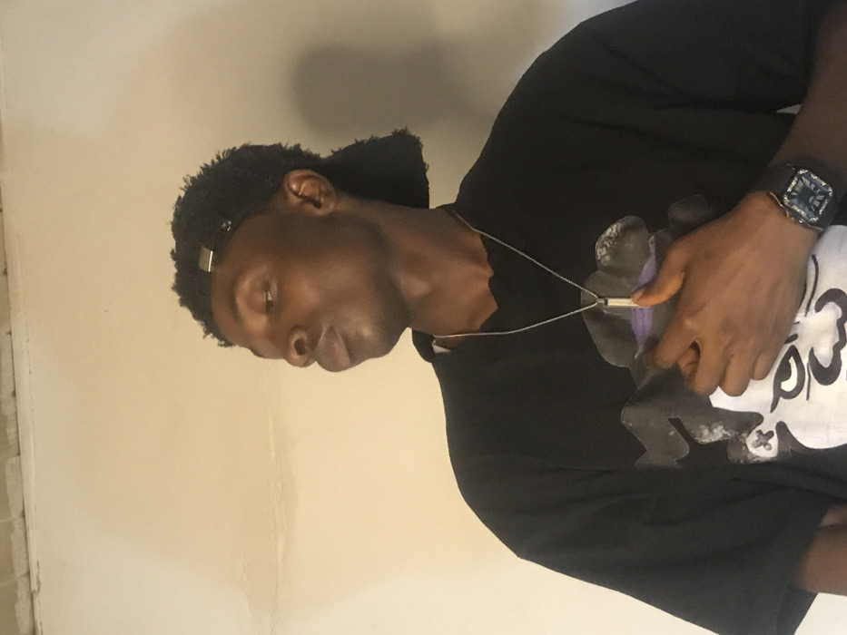 A male subject is depicted in a close-up, waist-up indoor portrait, reportedly located in the city of Kirana, Nigeria. The subject, who appears to be of African descent, is seen from the chest upwards, facing slightly right from the viewer's perspective, with his head tilted. His lips are distinctly pursed forward. He wears a black short-sleeved t-shirt featuring a stylized graphic design in white and purple hues across the chest. A silver-colored chain necklace with a rectangular pendant is visible around his neck. A dark wristwatch with a square or rectangular face is present on his left wrist. His dark, curly hair is partially obscured by a dark cap or bandana worn backward, which features a metallic clip. His right hand rests flat against his chest, specifically on the lower portion of the t-shirt's graphic. The background consists of a plain, light-colored (off-white or beige) wall, with a faint horizontal line or seam visible near the top left corner.