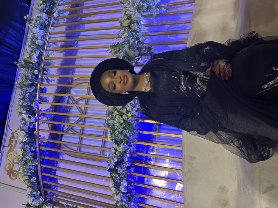 A woman in a black dress and hat sits against a backdrop of gold and white flowers. She wears a diamond necklace and earrings. Her hands have an intricate henna design. The backdrop features a semi-circular window design with gold bars and white flower garlands, illuminated by blue lights. The floor appears to be a neutral, light-colored tile or concrete. The image is slightly rotated.