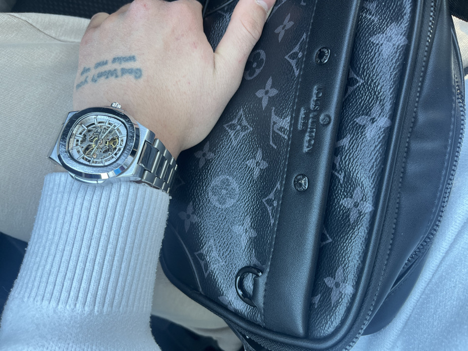 An overhead, close-up photograph depicts a person's left arm and hand resting on a black Louis Vuitton messenger bag. The individual wears a light-colored, possibly white or cream, ribbed long-sleeved garment, partially visible on the forearm. A silver-toned wristwatch with an octagonal or cushion-shaped bezel and a skeletonized dial, revealing gold-toned internal mechanisms, is worn on the left wrist. On the back of the left hand, a tattoo is visible, displaying text that appears to read "God Bless You" or similar phrasing in a cursive style. The hand's fingers are partially visible on the right side of the frame. The bag features the black and grey Louis Vuitton Monogram Eclipse pattern, and a black leather flap on its front bears the embossed "LOUIS VUITTON PARIS" logo, oriented upside down relative to the viewer. Two circular black metallic studs are present on this flap, along with a black D-ring on the bag's upper left corner. A zipper closure is visible along the bottom edge of the bag within the frame. The background is indistinct, showing light-colored fabric or upholstery, consistent with an interior setting. The location is Vratsa, Bulgaria.