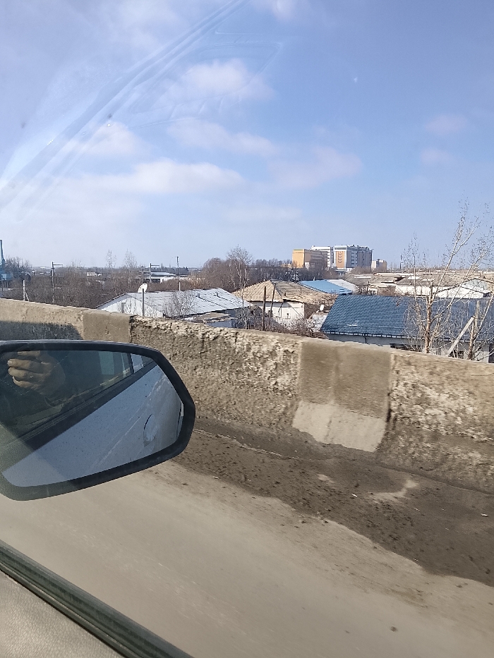The image depicts an outdoor scene in Khanka, Uzbekistan, viewed from the interior of a vehicle. The upper half of the frame shows a bright blue sky with scattered white cumulus clouds. In the lower left, a dark-framed vehicle side mirror reflects a partial view of a hand or arm wearing a dark sleeve. A weathered concrete barrier, exhibiting patches of grime and exposed lighter concrete, extends horizontally across the mid-foreground. Below this barrier, a sloping dirt embankment is visible. Beyond the barrier, the midground features a residential area with multiple single-story houses, displaying various roof colors including gray and blue, interspersed with bare deciduous trees. To the far left in the midground, a large blue industrial crane or structure is present. The background reveals a cluster of distant multi-story buildings, including a prominent light-colored structure featuring a vertical architectural element that resembles a stylized crescent moon or stacked 'C' shapes.